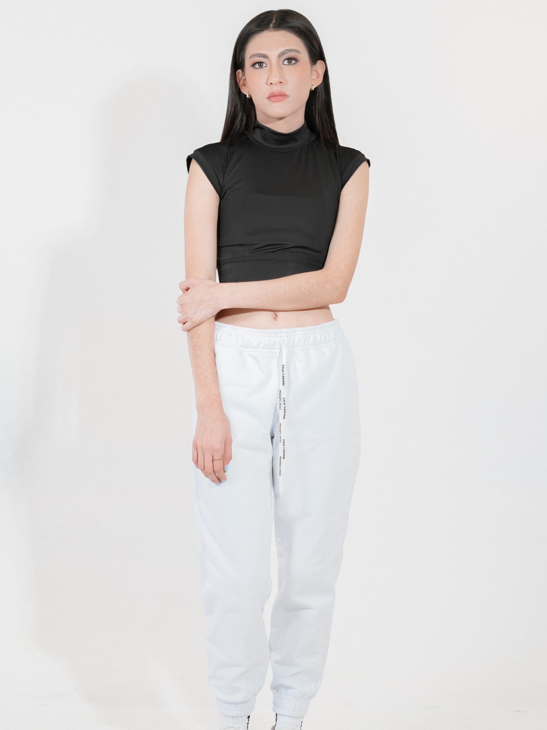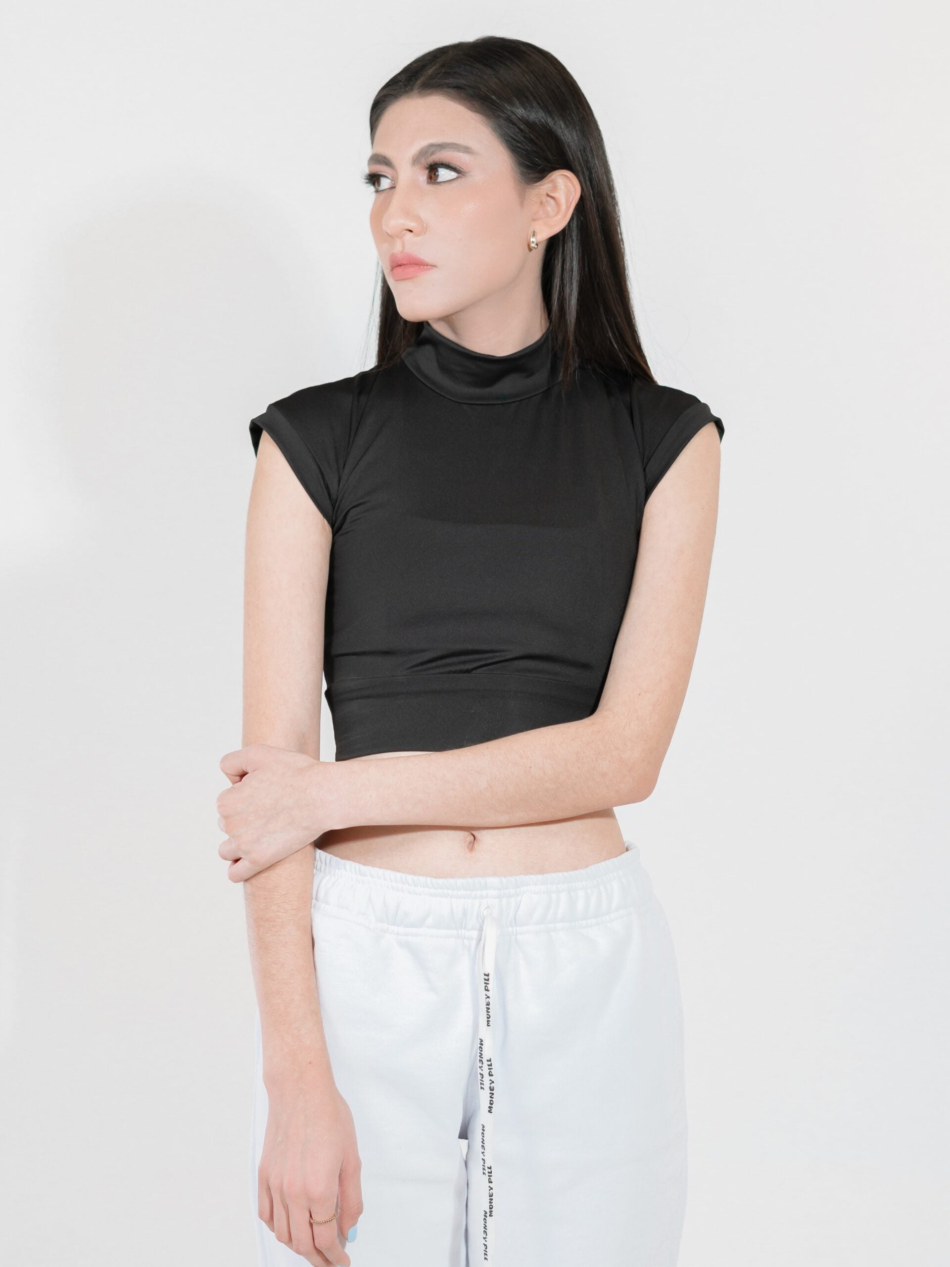 Corte suelto tipo cropped, con cuello subido estilo mock neck para mayor cobertura sin sofocar.